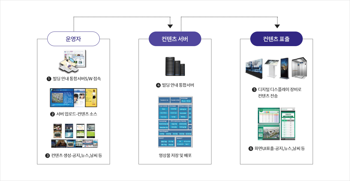 디스플레이 장비를 통해 건축물 내의 길 안내, 매장위치 및 소개, 이벤트 사항들을 시각적인 컨텐츠로 표출함으로써 이용객들이 원하는 정보를 제공하여 이용객들의 편의를 극대화하고 최첨단 건축물로서의 이미지 제고의 효과를 제공하는 솔루션 입니다.