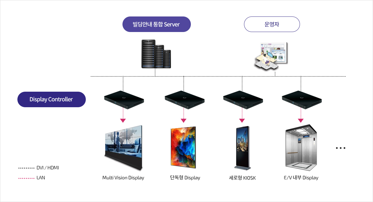 디스플레이 장비를 통해 고품질의 다양한 디지털 컨텐츠 (동영상, 이미지, 텍스트) 를 자유롭게 화면에 구성하고 배포하여 이용객에게 시각적인 컨텐츠를 제공하는 솔루션 입니다.