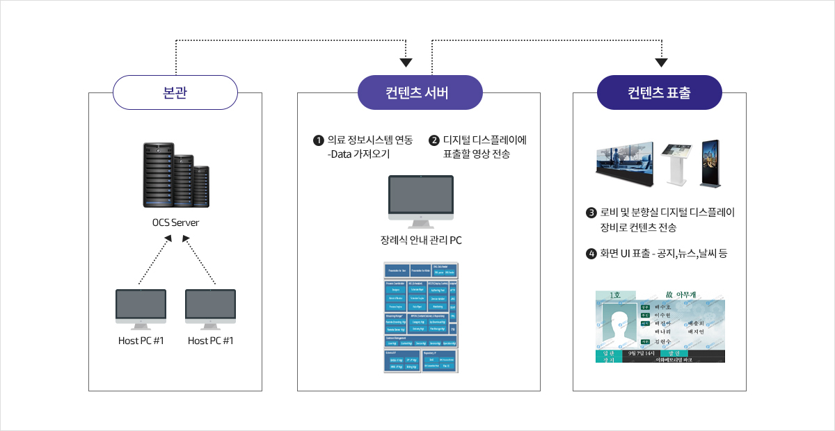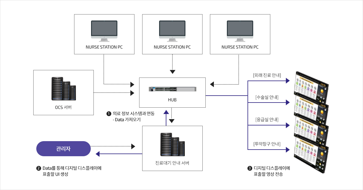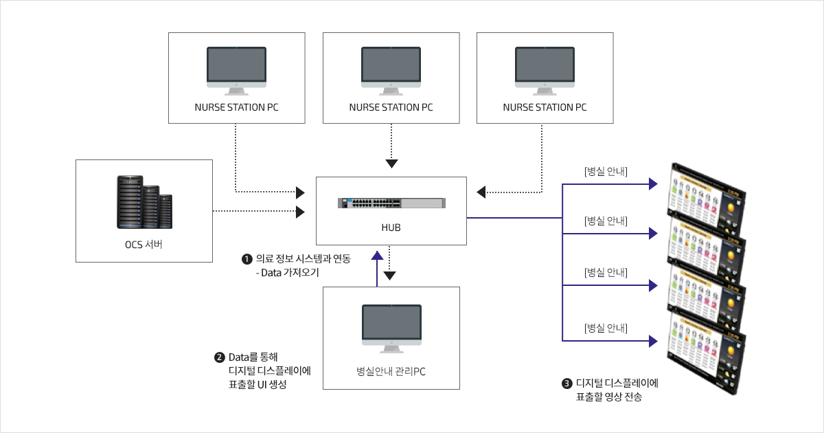 병원 의료정보 시스템 (OCS)과의 연동을 통해 환자의 예약/진료/검사 일정 등 관련정보를 디지털 디스플레이 장비를 통해 실시간으로 전달할 수 있는 기능을 제공하는 솔루션입니다.