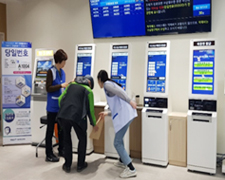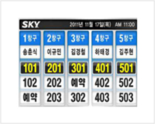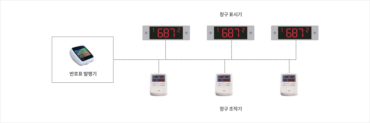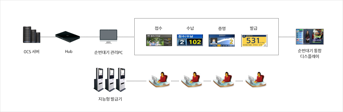번호표를 발급할 수 있는 발급기와 창구의 단순대기 정보를 표출하는 전광판 방식의 기존의 순서대기 시스템에서 벗어나 디지털 디스플레이 장비와 번호표 발급기능을 함께 탑재한 KIOSK 형태의 지능형 발급기와 창구에 디지털 디스플레이 장비를 도입한 지능형 순번대기 안내솔루션 입니다.